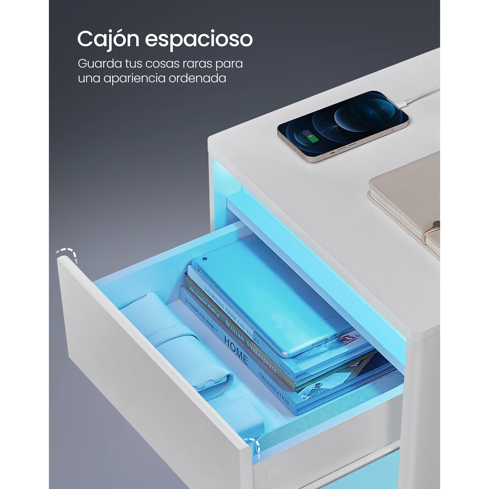 【TIRAS LED DOBLES】 Mejora el ambiente de tu espacio con las tiras LED dobles incorporadas en esta mesilla de noche. Con 25 colores, 6 niveles de brillo, 3 modos de parpadeo y 6 velocidades de parpadeo, puedes cambiar los colores y los modos libremente
