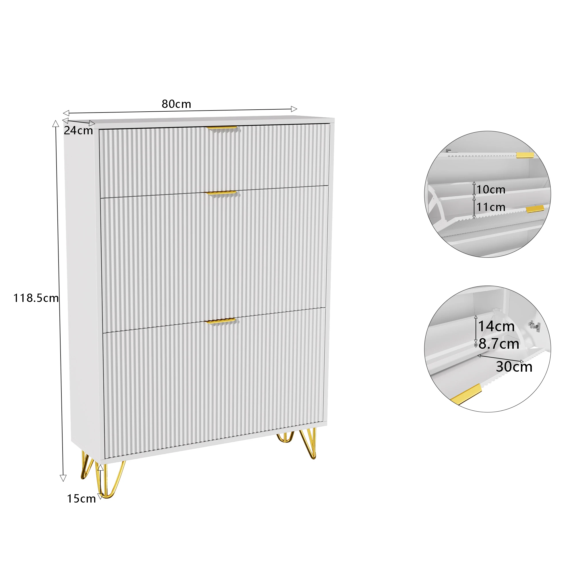 1. 【Zapatero con cajones abatibles】 Este zapatero está equipado con tres puertas abatibles y cuenta con un diseño de cajón con solapa que ahorra espacio que facilita la fácil apertura y cierre, protegiendo eficazmente sus zapatos del polvo.